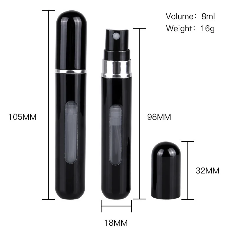 Muy pequeño y ligero: muy fácil de guardar tus perfumes favoritos y llevarlos contigo al trabajo, fiestas, vida social y viajes. El atomizador es seguro y compacto, adecuado para viajes aéreos, el tamaño de bolsillo se puede poner en una bolsa de cosméticos, puede contener una gran cantidad de perfume, la capacidad es de 8ml