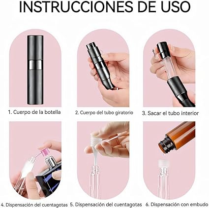• 【Fácil de usar】Esta botella perfume en spray no tiene tapón, simplemente gire la botella en el sentido de las agujas del reloj. Una vez que salga la boquilla, podrá utilizarla. Y después de eso, simplemente tire de la boquilla y gírela para abrirla y rellenar el líquido.